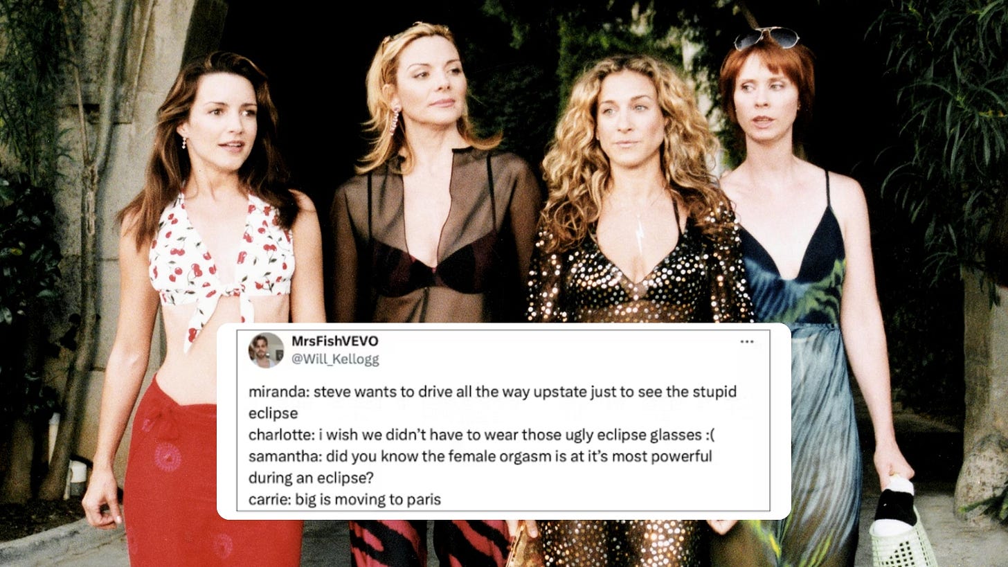 (I know it’s technically my job to explain these things, but that would just sour the joke, wouldn’t it? If you have yet to see Sex and the City, you can learn more here.)